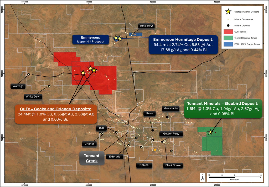 The strategic Tennant Creek Copper (and Gold) Alliance or TCCA was formed between member companies: CuFe Limited (CUF), Emmerson Resources Limited (ERM) and Tennant Minerals Limited (TMS) (the Parties) to investigate the potential for development of a single, multi-user processing facility for Copper, Gold and other Critical Metals for their Mineral Resources and recent high-grade exploration discoveries in the Tennant Creek region of the Northern Territory (see Figure 1 & 7).