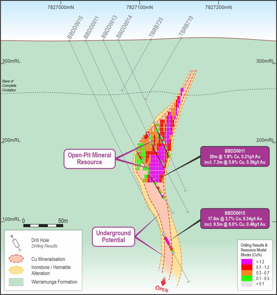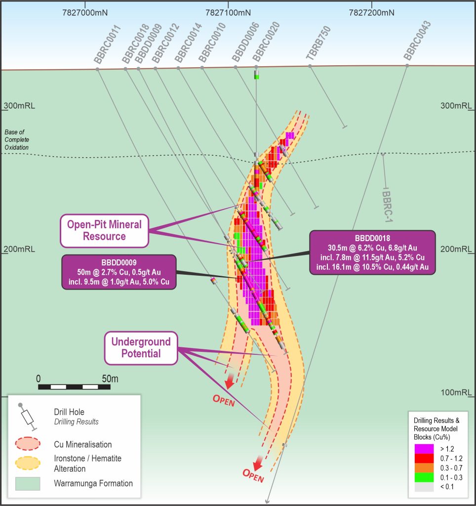 Drilling planned for 2026 will focus on extending the main Bluebird discovery and testing potential structural and mineralised connections with the nearby Bluebird East and Bluebird West exploration targets. Updated interpretation of drilling data indicates that the Bluebird mineralisation comprises four large, high-grade copper-gold lenses, hosted within an east–west trending, highly mineralised ironstone unit. This interpretation significantly enhances the exploration potential of the project, suggesting possible extensions to the east, west, and down-plunge of the current defined mineralised zone and mineral resource.